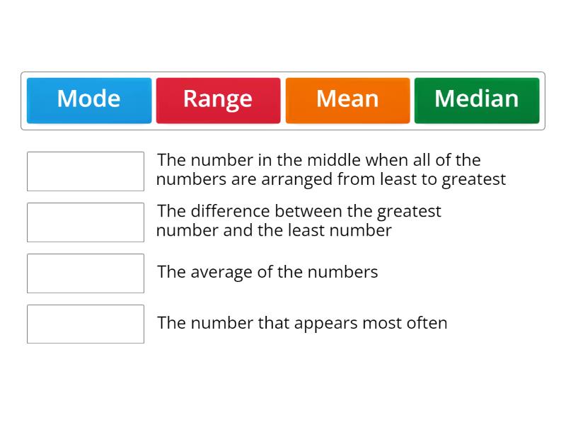 Mean - The average of the numbers, Median - The number in the middle when all of the numbers are arranged from least to greatest, Mode - The number that appears most often, Range - The difference between the greatest number and the least number,