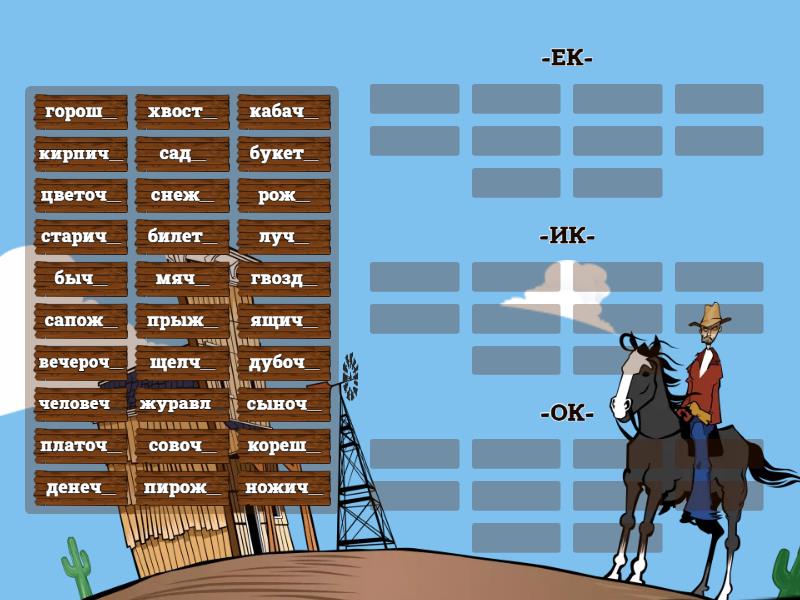 -ЕК-: совоч__, человеч__, ящич__, вечероч__, ножич__, сыноч__, денеч__, платоч__, цветоч__, дубоч__, -ИК-: букет__, хвост__, билет__, кирпич__, сад__, сапож__, луч__, мяч__, журавл__, гвозд__, -ОК-: прыж__, щелч__, горош__, пирож__, рож__, старич__, снеж__, кабач__, быч__, кореш__,