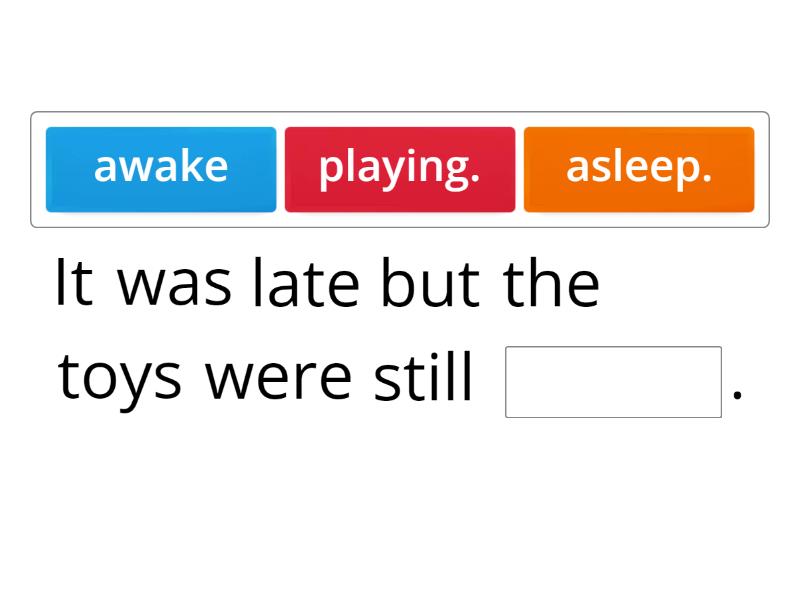 It was late but the toys were still ____. Pam had torn her peach ____. "I love to fix things" said Robot ____. Captain Stomp had lost his ____ cap. Ted threw a ____ for Ben.