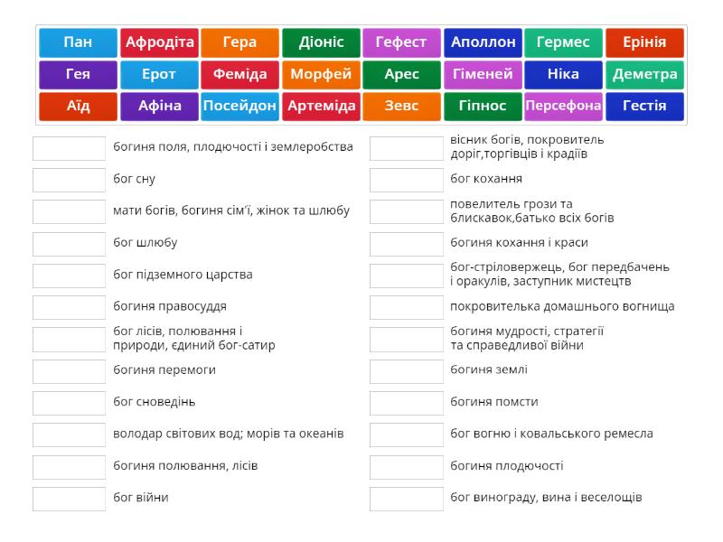 Аїд - бог підземного царства, Аполлон - бог-стріловержець, бог передбачень і оракулів, заступник мистецтв, Арес - бог війни, Ерот - бог кохання, Феміда - богиня правосуддя, Персефона - богиня плодючості, Ніка - богиня перемоги, Посейдон - володар світових вод; морів та океанів, Пан - бог лісів, полювання і природи, єдиний бог-сатир, Деметра - богиня поля, плодючості і землеробства, Зевс - повелитель грози та блискавок,батько всіх богів, Діоніс - бог винограду, вина і веселощів, Морфей - бог сноведінь, Гефест - бог вогню і ковальського ремесла, Гея - богиня землі, Гестія - покровителька домашнього вогнища, Гермес - вісник богів, покровитель доріг,торгівців і крадіїв, Гера - мати богів, богиня сім'ї, жінок та шлюбу, Афродіта - богиня кохання і краси, Афіна - богиня мудрості, стратегії та справедливої війни, Артеміда - богиня полювання, лісів, Ерінія - богиня помсти, Гіменей - бог шлюбу, Гіпнос - бог сну,