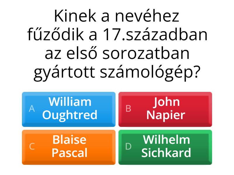1) Kinek a nevéhez fűződik a 17.században az első sorozatban gyártott számológép? a) William Oughtred b) John Napier c) Blaise Pascal d) Wilhelm Sichkard 2) Ki készítette 1623-ban azt a számológépet, amely mind a négy alapműveletet (összeadás, kivonás, szorzás, osztás) el tudta végezni? a) Gottfried Wilhelm von Leibniz b) William Oughtred c) Wilhelm Sichkard d) John Napier 3) Ki készítette el 1673-ban Németországban az első olyan gépet, amely már a kettes számrendszeren alapult? a) Gottfried Wilhelm von Leibniz b) William Oughtred c) Wilhelm Sichkard d) Blaise Pascal 4) Ki volt a lyukártya megalkotója, amit a XIX. században szövőszékek vezérlésére használtak? a) Gottfried Wilhelm von Leibniz b) Charles X. Thomas de Colmar c) Charles Babbage d) Joseph Marie Jacquard 5) Melyik számítógép generációhoz tartoznak a mechanikus és elektromechanikus számítógépek? a) 0. generáció b) 1. generáció c) 2. generáció d) 3. generáció e) 4. generáció f) 5. generáció 6) Melyik számítógép generációhoz tartoznak a tranzisztoros számítógépek? a) 0. generáció b) 1. generáció c) 2. generáció d) 3. generáció e) 4. generáció f) 5. generáció 7) Melyik számítógép generációhoz tartoznak az elektroncsöves számítógépek? a) 0. generáció b) 1. generáció c) 2. generáció d) 3. generáció e) 4. generáció f) 5. generáció 8) Melyik számítógép generációhoz tartoznak az intelligens számítógépek? a) 0. generáció b) 1. generáció c) 2. generáció d) 3. generáció e) 4. generáció f) 5. generáció 9) Melyik számítógép generációhoz tartoznak a többprocesszoros számítógépek? a) 0. generáció b) 1. generáció c) 2. generáció d) 3. generáció e) 4. generáció f) 5. generáció 10) Melyik számítógép generációhoz tartoznak az IC, integrált áramkörös számítógépek? a) 0. generáció b) 1. generáció c) 2. generáció d) 3. generáció e) 4. generáció f) 5. generáció 11) Kinek a nevéhez fűződik a Basic nyelv feltalálása? a) William Oughtred b) John Napier c) Blaise Pascal d) Wilhelm Sichkard e) Kemény János f) Neumann János 12) Kinek a nevéhez fűződik a digitális számítógép elvének feltalálása? a) Charles Babbage b) John Napier c) Blaise Pascal d) Wilhelm Sichkard e) Kemény János f) Neumann János 13) Kinek a nevéhez fűződik az 5 számtani műveletet végző gép megalkotása? a) Charles Babbage b) John Napier c) Howard H. Aiken d) Wilhelm Sichkard e) Kemény János f) Neumann János 14) Kinek a nevéhez fűződik az első jelfogókkal működő számológép elkészítése? a) Charles Babbage b) John Napier c) Konrad Zuse d) Wilhelm Sichkard e) Howard H. Aiken f) Neumann János