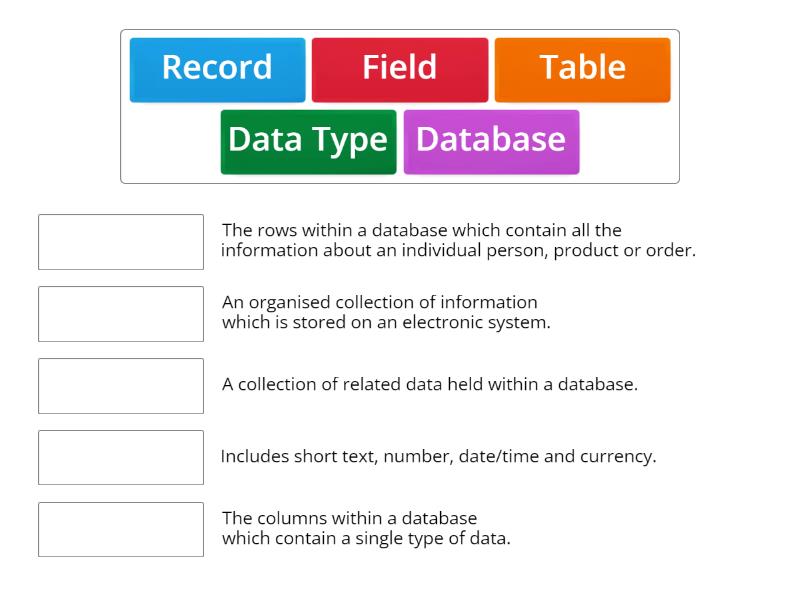 Database - An organised collection of information which is stored on an electronic system., Table - A collection of related data held within a database. , Field - The columns within a database which contain a single type of data., Record - The rows within a database which contain all the information about an individual person, product or order., Data Type - Includes short text, number, date/time and currency.,