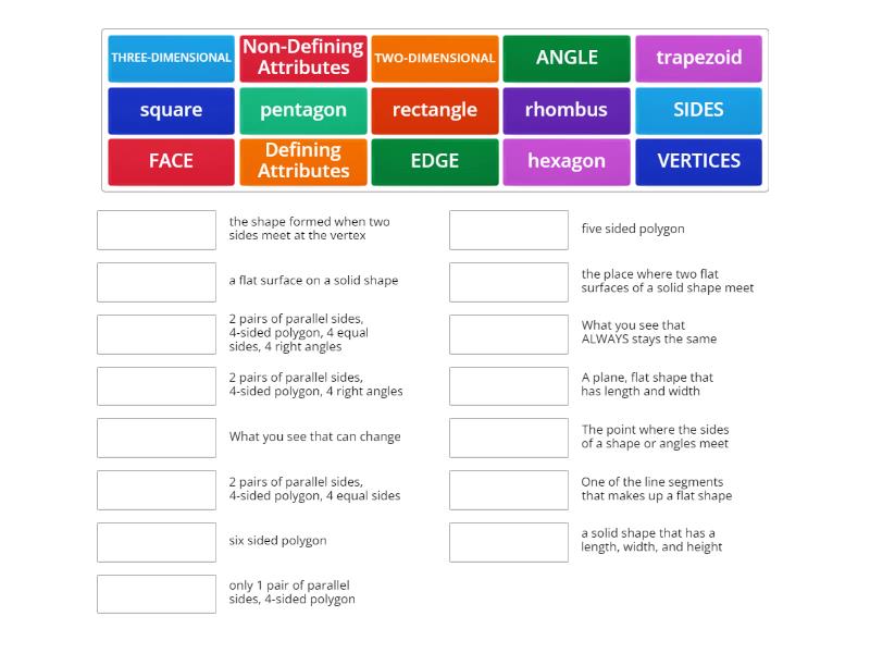 TWO-DIMENSIONAL - A plane, flat shape that has length and width, VERTICES - The point where the sides of a shape or angles meet, THREE-DIMENSIONAL - a solid shape that has a length, width, and height, FACE - a flat surface on a solid shape, SIDES - One of the line segments that makes up a flat shape, EDGE - the place where two flat surfaces of a solid shape meet, ANGLE - the shape formed when two sides meet at the vertex, Defining Attributes - What you see that ALWAYS stays the same, Non-Defining Attributes - What you see that can change, trapezoid - only 1 pair of parallel sides, 4-sided polygon, rectangle - 2 pairs of parallel sides, 4-sided polygon, 4 right angles, square - 2 pairs of parallel sides, 4-sided polygon, 4 equal sides, 4 right angles, rhombus - 2 pairs of parallel sides, 4-sided polygon, 4 equal sides, pentagon - five sided polygon , hexagon - six sided polygon,