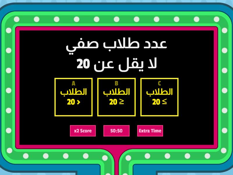 1) عدد طلاب صفي لا يقل عن 20 a) الطلاب > 20 b) الطلاب ≥ 20 c) الطلاب ≤ 20 2) 7 ≤ y-4 a) 11 ≤ y b) 13 ≥ y c) 11 ≥ y 3) y-6 ≥ -10  a) y ≤ -4 b) y ≥ -4 c) y > - 14 4) a + 1/2 < 2  a) a < 1.5 b) a ≤ 1.5 c) a < 2/2 5) x/8 > -5 a) x ≥ - 40 b) x ≤ -13 c) x > -40 6) -7k > -56 a) k < 8 b) -k > 8 c) - k ≤ 8 7) 5y -8 < 12 a) y ≤ 4 b) y < 4 c) y ≥ 5 8) 3 (x + 4 ) > 4x -5 a) 17 > x b) 12 x ≥ x c) 55 9) x/2 + 4 < 7 a) x ≤ 9 b) x < 6 c) 6 < x 10) 3 (x-3) < 15= a) x < 8 b) 2x < 7 c) x ≤ 8