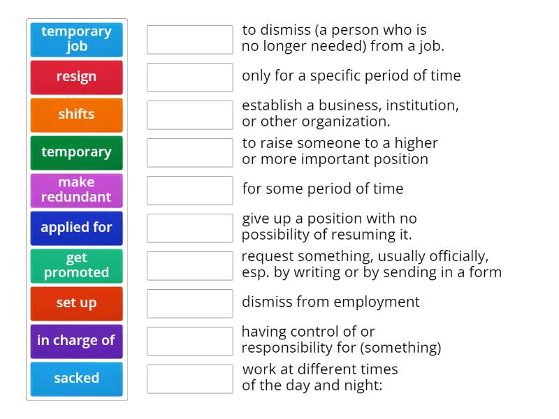 get promoted  - to raise someone to a higher or more important position, make redundant  - to dismiss (a person who is no longer needed) from a job., temporary job  - only for a specific period of time, sacked - dismiss from employment, set up  - establish a business, institution, or other organization., temporary  - for some period of time , in charge of  - having control of or responsibility for (something), resign  - give up a position with no possibility of resuming it., shifts  - work at different times of the day and night:, applied for  - request something, usually officially, esp. by writing or by sending in a form,