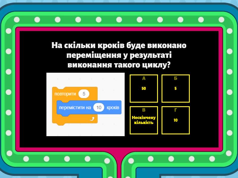 1) Для чого в середовищі програмування Scratch використовується дана команда? a) Для запуску програми b) Щоб повторити (продублювати) графічний образ c) Для зміни вигляду виконавця 2) Скільки разів буде виконано повторення команд розміщених в даній команді? a) Нескінчену кількість b) 100 c) 1 d) 10 3) Скільки разів буде виконано повторення команд розміщених в даній команді? a) 100 b) 10 c) Нескінчену кількість d) 1 4) Для чого в середовищі програмування Scratch використовується дана команда? a) Для переміщення виконавця на 10 координат вниз b) Для переміщення виконавця на 10 координат вгору c) Для переміщення виконавця на 10 координат вліво d) Для переміщення виконавця на 10 координат вправо 5) Для чого в середовищі програмування Scratch використовується дана команда? a) Для переміщення виконавця на 10 координат вниз b) Для переміщення виконавця на 10 координат вгору c) Для переміщення виконавця на 10 координат вліво d) Для переміщення виконавця на 10 координат вправо 6) Для чого в середовищі програмування Scratch використовується дана команда? a) Для переміщення виконавця на 10 координат вниз b) Для переміщення виконавця на 10 координат вгору c) Для переміщення виконавця на 10 координат вліво d) Для переміщення виконавця на 10 координат вправо 7) Для чого в середовищі програмування Scratch використовується дана команда? a) Для переміщення виконавця на 10 координат вниз b) Для переміщення виконавця на 10 координат вгору c) Для переміщення виконавця на 10 координат вліво d) Для переміщення виконавця на 10 координат вправо 8) На скільки кроків буде виконано переміщення у результаті виконання такого циклу? a) 50 b) 5 c) Нескінчену кількість d) 10 9) На скільки градусів буде виконано поворот у результаті виконання такого циклу? a) на 150 градусів проти годинникової стрілки b) на 15 градусів за годинниковою стрілкою c) на 150 градусів за годинниковою стрілкою d) на 15 градусів проти годинникової стрілки 10) За допомогою якої команди можна зберегти проєкт створений в онлайн середовищі Scratch на свій комп’ютер? a) Зберегти негайно b) Зберегти як копію c) Завантажити з вашого комп'ютера d) Вивантажити на ваш комп'ютер