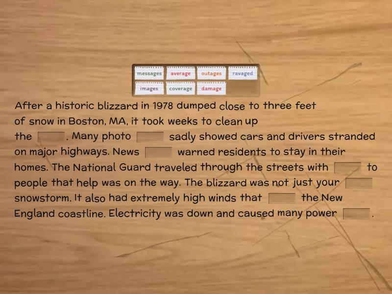 After a historic blizzard in 1978 dumped close to three feet of snow in Boston, MA, it took weeks to clean up the ____. Many photo ____ sadly showed cars and drivers stranded on major highways. News ____ warned residents to stay in their homes. The National Guard traveled through the streets with ____ to people that help was on the way. The blizzard was not just your ____ snowstorm. It also had extremely high winds that ____ the New England coastline. Electricity was down and caused many power ____.