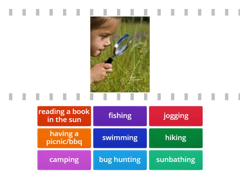 bug hunting, jogging, having a picnic/bbq, hiking, camping, swimming, sunbathing, reading a book in the sun, fishing,
