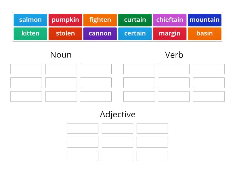 Noun: pumpkin, basin, cannon, chieftain, curtain, kitten, margin, mountain, salmon, Verb: fighten, Adjective: certain, stolen,