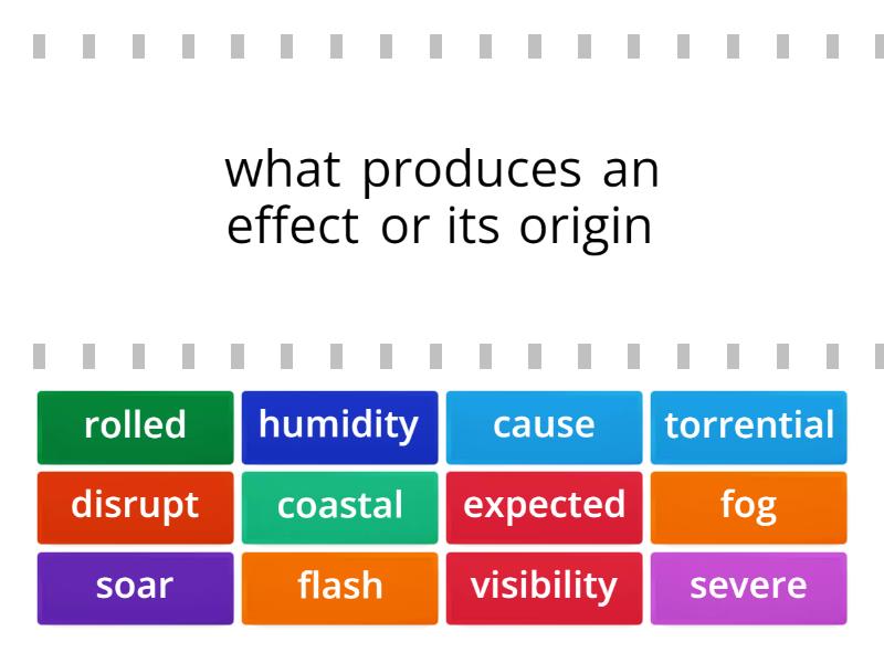 cause  - what produces an effect or its origin, expected - likely to happen, flash - appear for a short time, rolled - to move or advance, severe - serious, humidity - the percentage of water in the air, coastal - relating to the area by the sea, disrupt - to interrupt, soar - rise or rocket, torrential - lots and lots of something, visibility - the ability to see under poor circumstances, fog - a thick cloud or water droplets that makes it difficult to see, normally in the morning,