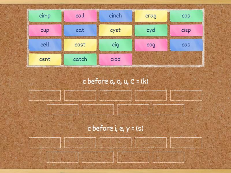 c before a, o, u, C = (k): cat, cog, cap, cost, catch, call, cup, cop, crag, c before i, e, y = (s): cell, cyst, cinch, cent, cidd, cig, cyd, cisp, cimp,