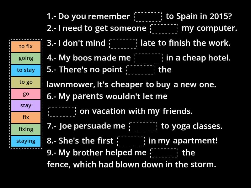 1.- Do you remember ____ to Spain in 2015? 2.- I need to get someone ____ my computer. 3.- I don't mind ____ late to finish the work. 4.- My boos made me ____ in a cheap hotel. 5.- There's no point ____ the lawnmower, It's cheaper to buy a new one. 6.- My parents wouldn't let me ____ on vacation with my friends. 7.- Joe persuade me ____ to yoga classes. 8.- She's the first ____ in my apartment! 9.- My brother helped me ____ the fence, which had blown down in the storm.