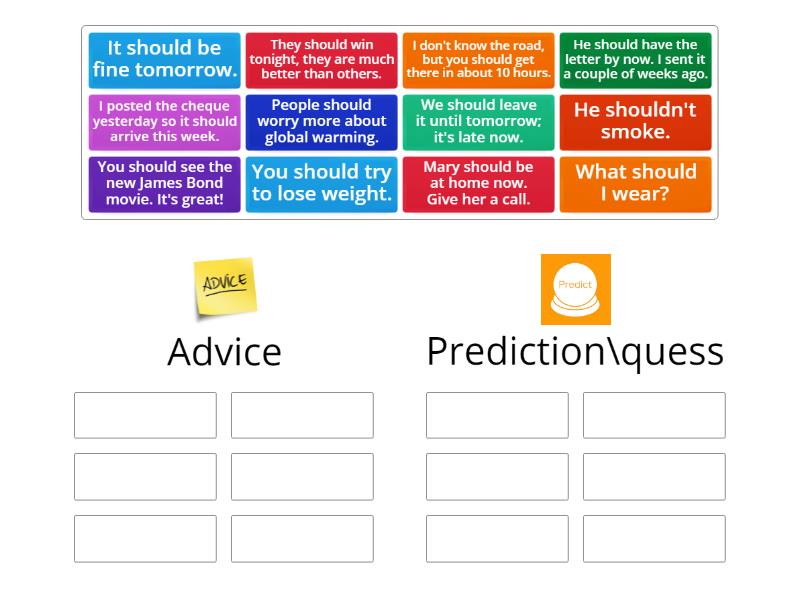 Advice: You should see the new James Bond movie. It's great!, He shouldn't smoke., You should try to lose weight., We should leave it until tomorrow; it's late now., People should worry more about global warming., What should I wear?, Prediction\quess: I don't know the road, but you should get there in about 10 hours., They should win tonight, they are much better than others., Mary should be at home now. Give her a call., He should have the letter by now. I sent it a couple of weeks ago., It should be fine tomorrow., I posted the cheque yesterday so it should arrive this week.,