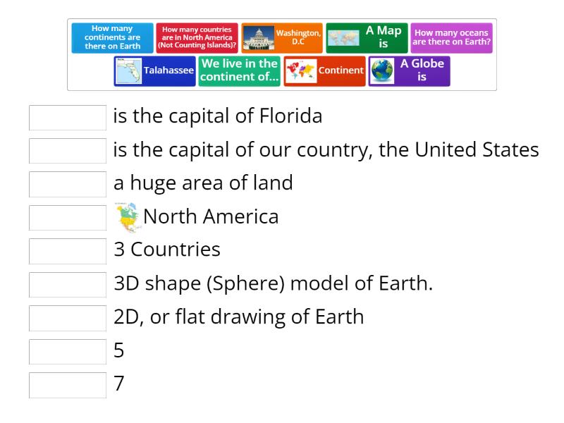 Talahassee - is the capital of Florida, Washington, D.C - is the capital of our country, the United States, Continent - a huge area of land, We live in the continent of... - North America, How many countries are in North America (Not Counting Islands)? - 3 Countries, A Globe is - 3D shape (Sphere) model of Earth., A Map is - 2D, or flat drawing of Earth, How many oceans are there on Earth? - 5, How many continents are there on Earth - 7,