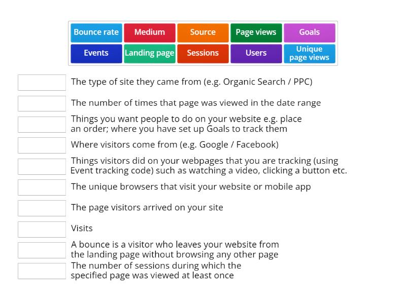Source - Where visitors come from (e.g. Google / Facebook), Sessions - Visits, Page views - The number of times that page was viewed in the date range, Landing page - The page visitors arrived on your site, Users - The unique browsers that visit your website or mobile app, Bounce rate - A bounce is a visitor who leaves your website from the landing page without browsing any other page, Goals - Things you want people to do on your website e.g. place an order; where you have set up Goals to track them, Unique page views - The number of sessions during which the specified page was viewed at least once, Medium - The type of site they came from (e.g. Organic Search / PPC), Events - Things visitors did on your webpages that you are tracking (using Event tracking code) such as watching a video, clicking a button etc.,