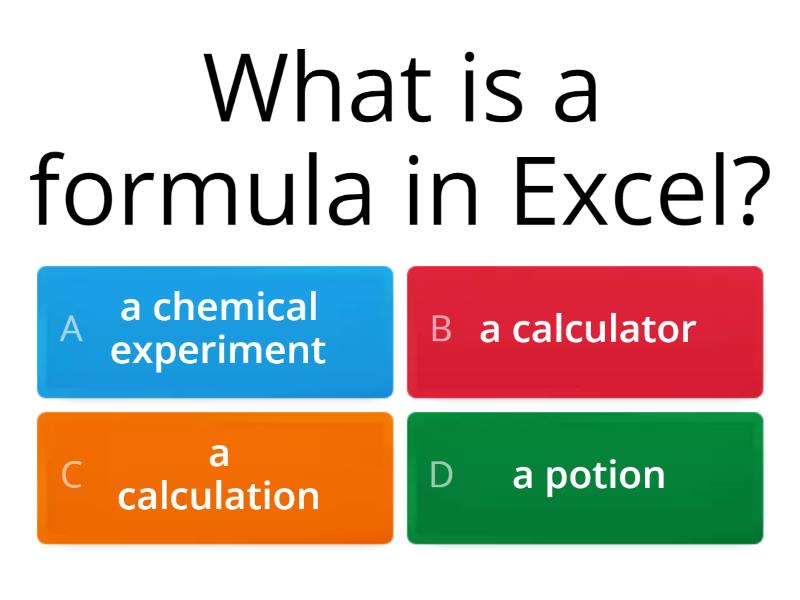 1) What is a formula in Excel? a) a chemical experiment b) a calculator c) a calculation d) a potion 2) What is a function in Excel? a) a banquet b) a cell name c) a pre-defined formula d) a worksheet 3) What does cell referencing mean in formula and functions? a) the value in the cell is used rather than the cell address b) the cell address is used rather than the value in the cell c) the name of the function being used 4) What is a relative cell reference? a) the cell address changes relative to the row or column it is copied to b) the cell address does not change no matter where it is copied to c) a cell that relates to another cell 5) What is an absolute cell reference in a formula? a) the cell address does not change no matter where it is copied to b) the cell address does change every time it is copied to another location c) the cell address must be entered 6) How do you make a cell absolute? a) use the F2 Key b) use the F3 key c) use the F4 key d) use the F5 key 7) Which of the following formulae contains an absolute cell reference? a) =A2+B2 b) =A2*B$2$ c) =A2*$B$2