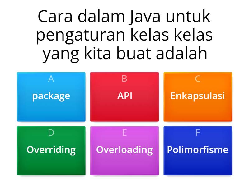 1) Cara dalam Java untuk pengaturan kelas kelas yang kita buat adalah a) package b) API c) Enkapsulasi d) Overriding e) Overloading f) Polimorfisme 2) Subpaket yang berisi kelas kelas yang mendukung Abstract Window Toolkit a) java.lang b) java.io c) java.net d) java.util e) java.awt 3) Subpaket yang berisi kelas kelas Input/Output a) java.lang b) java.io c) java.net d) java.util e) java.awt 4) Subpaket yang berisi kelas kelas yang mendukung jaringan komputer a) java.lang b) java.io c) java.net d) java.util e) java.awt 5) Subpaket yang berisi kelas kelas untuk kelas utilitas, termasuk framework a) java.lang b) java.io c) java.net d) java.util e) java.awt 6) Subpaket yang berisi kelas kelas dengan kegunaan yang umum a) java.lang b) java.io c) java.net d) java.util e) java.awt 7) Level dalam paket berfungsi untuk a) memastikan keunikan dari nama import b) memastikan keunikan dari nama paket c) memastikan keunikan dari nama kelas d) memastikan keunikan dari nama method e) memastikan keunikan dari nama variabel 8) Sarana untuk mengumpulkan kelas menjadi kesatuan, berikut merupakan definisi dari a) Kelas b) Object c) Method d) Package e) Variabel 9) Keunggulan Konsep paket adalah berikut, kecuali a) Penghimpunan kelas kelas dalam satu unit b) Program menjadi lebih berat dan  c) Mempermudah pencarian kelas kelas d) Menghindari konflik akibat penamaan kelas yang sama e) Kelas kelas dalam suatu paket terlindungi dari akses diluar paket 10) Cara yang benar untuk mendeklarasikan paket a) package namapaket; b) package namapaket: c) package namapaket d) package namapaket. e) package namapaket,