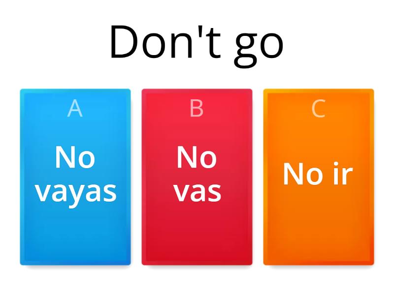 1) Don't go a) No vayas b) No vas c) No ir 2) Don't eat a) No come b) No coma c) No comas 3) Don't Speak a) No hable b) No hables c) No hablas 4) Don't put it on the table a) No póngalo en la mesa b) No lo ponga en la mesa c) No lo pongas en la mesa 5) Don't come to the party a) No venga a la fiesta b) No vengas a la fiesta c) No ven a la fiesta 6) Don't read a) No lees b) No lea c) No leas 7) Don't write the letter a) No escribas la carta b) No escribes la carta c) No escriban la carta 8) Don't get up a) No se levante b) No se levanten c) No te levantes 9) Don't run with scissors a) No corre con tijeras b) No corras con tijeras c) No corren con tijeras 10) Don't eat them a) No los comas b) No los comen c) No los coman 11) Don't learn Spanish a) No aprender español b) No aprenda español c) No aprendas español 12) Don't jump a) No saltas b) No saltes c) No saltan 13) Don't die a) No te mueras b) No te moriste c) No se muera