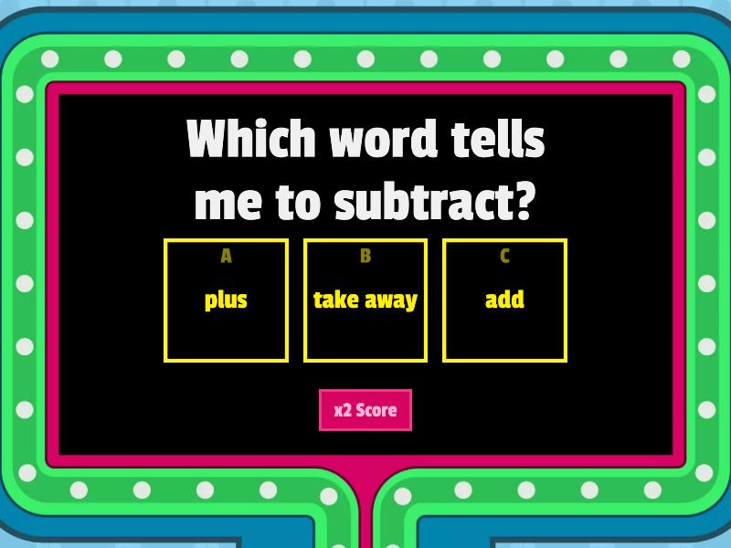 1) Which word tells me to subtract? a) plus b) take away c) add 2) Which word tells me to subtract? a) increase b) halve c) decrease 3) Which word tells me to subtract? a) the same b) difference c) inference 4) Which word tells me to subtract? a) credit b) debit c) total 5) Which word tells me to subtract? a) deposit b) withdraw c) account 6) Which word tells me to subtract? a) combine b) more than c) less than 7) Which word tells me to subtract? a) discount b) sum c) product 8) Which word tells me to subtract? a) right under b) underneath c) over the top d) left over 9) Which word tells me to subtract? a) increase b) reduce c) share 10) Which word tells me to subtract? a) grow b) fewer more c) fewer than 11) What is the symbol for subtraction? a) = b) + c) x d) % e) - f) /
