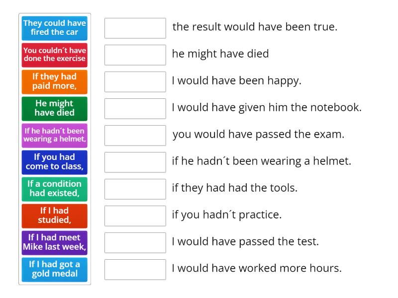 If I had got a gold medal - I would have been happy., If I had meet Mike last week, - I would have given him the notebook., If you had come to class, - you would have passed the exam., If he hadn´t been wearing a helmet, - he might have died, He might have died - if he hadn´t been wearing a helmet., If a condition had existed, - the result would have been true., If I had studied, - I would have passed the test., They could have fired the car - if they had had the tools., If they had paid more, - I would have worked more hours., You couldn´t have done the exercise - if you hadn´t practice.,