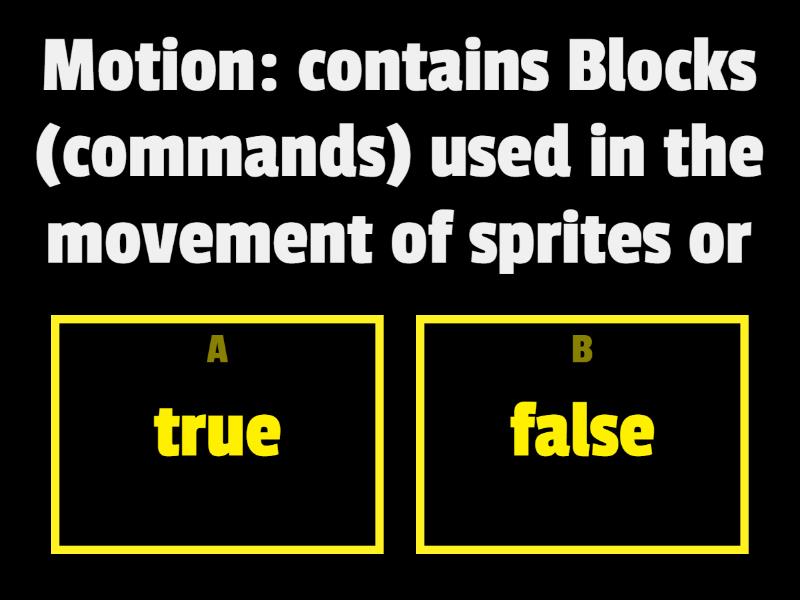 1) Motion: contains Blocks (commands) used in the movement of sprites or  a) true b) false 2) Code blocks : Is the set of commands that are installed in a particular Script area (as game Puzzles). a) true b) false 3) events) on sprites to start implementation of the project (such as pressing a key on the keyboard or click on the sprite.) a) true b) false 4) Looks: contain Blocks using control patterns and shapes of sprites and colors a) true b) false 5) You can control the show or hide a sprite on the stage. a) true b) false