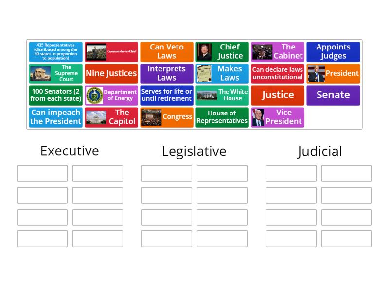 Executive: The White House, President, Vice President, The Cabinet, Commander-in-Chief, Can Veto Laws, Department of Energy, Appoints Judges, Legislative: The Capitol, Congress, House of Representatives, Senate, Makes Laws, 100 Senators (2 from each state), 435 Representatives (distributed among the 50 states in proportion to population), Can impeach the President , Judicial: The Supreme Court, Interprets Laws, Chief Justice, Nine Justices, Justice, Can declare laws unconstitutional, Serves for life or until retirement,