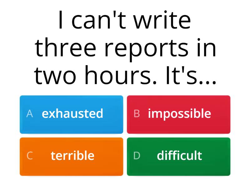 1) I can't write three reports in two hours. It's... a) exhausted b) impossible c) terrible d) difficult 2) It's over 35 degrees C outside. It's... a) hot b) freezing c) boiling d) delicious 3) The food at that restaurant is... a) simply delicious b) impossible c) exhausting d) boiling 4) I loved that exhibition about Egypt. It was... a) freezing b) impossible c) excited d) fascinating 5) I had to take a photo of the sunset. It was... a) absolutely enormous b) awesome c) really fascinating d) furious 6) I can't finish that piece of cake. It's... a) absolutely enormous b) boiling c) really beautiful d) delicious