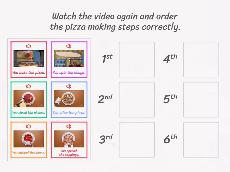 You spin the dough., You spread the sauce., You shred the cheese., You spread the toppings., You bake the pizza., You slice the pizza..