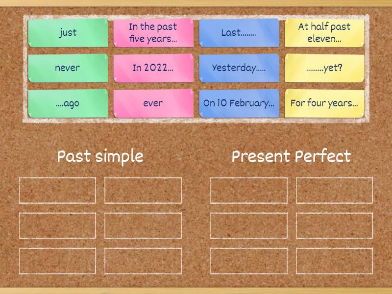 Past simple: ....ago, Last........, In 2022..., Yesterday....., At half past eleven..., On 10 February..., Present Perfect: For four years..., In the past five years..., .........yet?, just, never, ever,