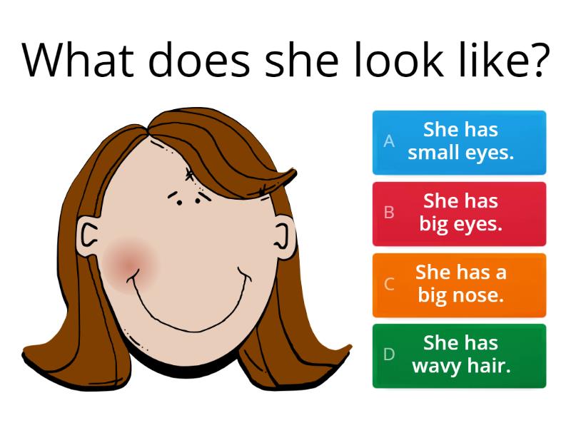 1) What does she look like? a) She has small eyes. b) She has big eyes. c) She has a big nose. d) She has wavy hair. 2) What does she look like? a) She is old. b) She is blonde. c) She is fat. d) She is ugly. 3) What does she look like? a) She has small eyes. b) She has a yellow headscarf. c) She has big eyes. d) She has a green headscarf. 4) What does he look like? a) He is short. b) He is fat. c) He is tall. d) He is old. 5) What does she look like? a) She has wavy hair. b) She has curly hair. c) She has straight hair. d) She has fair hair. 6) What does she look like? a) She has wavy hair. b) She has straight hair. c) She has curly hair. d) She has fair hair. 7) What does he look like? a) He has small eyes. b) He has a small nose. c) He has straight hair. d) He has a big nose. 8) What does he look like? a) He has blonde hair. b) He has a small nose. c) He has Black hair. d) He has green eyes. 9) What does she look like? a) She has long hair. b) She has short hair. c) She has blonde hair. d) She has black hair. 10) What does she look like? a) She is fat. b) She is thin. c) She is old. d) She has dark hair. 11) What does he look like? a) He has long hair. b) He has blonde hair. c) He has curly hair. d) He has short hair. 12) What does she look like? a) She has wavy hair. b) She has curly hair. c) She has blonde hair. d) She has straight hair. 13) What does she look like? a) She has dark hair. b) She has blonde hair. c) She has short hair. d) She has curly hair. 14) What does he look like? a) He is handsome. b) He is ugly. c) He is fat. d) He is old.