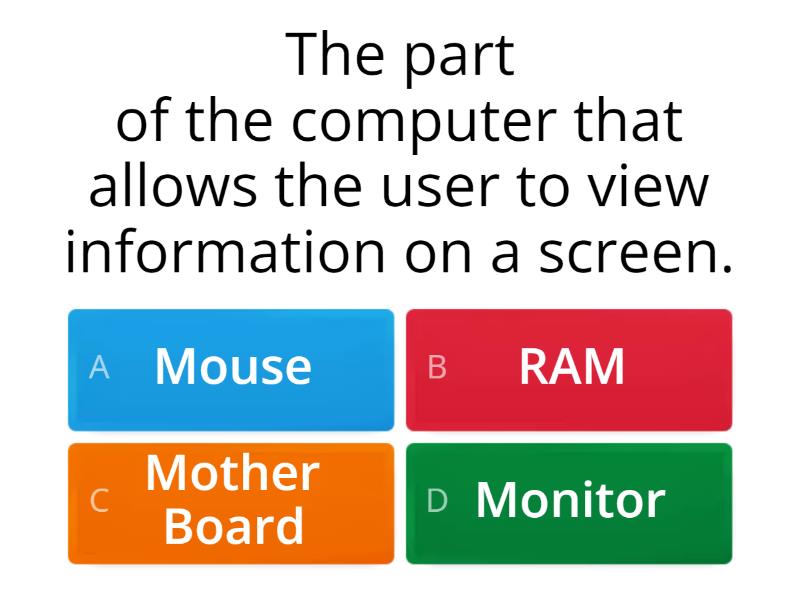 1) The part of the computer that allows the user to view information on a screen. a) Mouse b) RAM c) Mother Board d) Monitor 2) Another name for all the parts of a computer. a) Process b) Monitor c) Hardware d) Software 3) WWW stands for: a) World Worm Web b) World Wide Web c) World Word We d) World Web Wide 4) Which of the following is a storage device? a) Hard Disk b) USB Disk c) Floppy Disk d) All of the above 5) Who is the Father of Computer a) Charles Babbage b) Thomas Edison c) Albert Einstein d) Isaac Newton