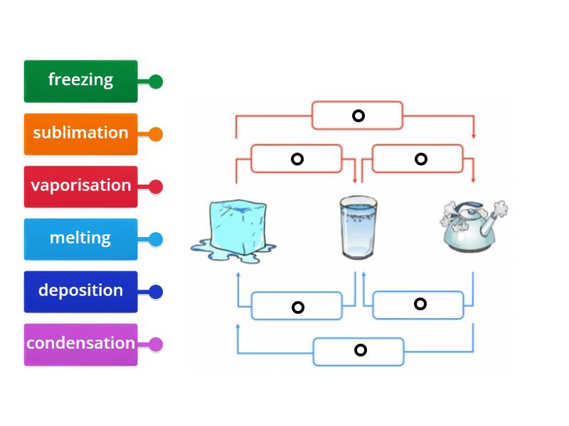 melting, vaporisation, sublimation, freezing, condensation, deposition.