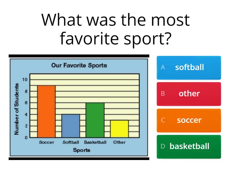 1) What was the most favorite sport?  a) softball b) other c) soccer d) basketball 2) What was the least favorite sport? a) other b) softball c) basketball d) soccer 3) What was the most favorite subject? a) reading b) math c) science d) social studies 4) What was the least favorite subject? a) reading b) math c) science d) social studies