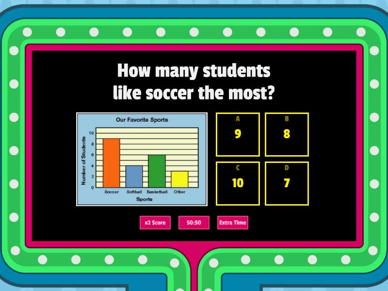 1) How many students like soccer the most? a) 9 b) 8 c) 10 d) 7 2) How many students like softball the most? a) 5 b) 4 c) 3 d) 7 3) How many more students like basketball than softball? a) 3 b) 2 c) 1 d) 4 4) How many more students need to like softball to have the same amount at soccer? a) 4 b) 6 c) 5 d) 8 5) What is the day that has the most children? a) Tuesday b) Thursday c) Monday d) Wednesday 6) How many children attend on Thursdays and Fridays altogether? a) 7 b) 4 c) 3 d) 8 7) How many fewer children attend on Tuesdays than they do on Mondays? a) 3 b) 6 c) 1 d) 4 8) What is the most popular snack on this bar graph? a) Popcorn b) Cheese c) Vegetables d) Fruit 9) What is the least popular snack on this bar graph? a) crackers b) Cheese c) Trail Mix d) Fruit 10) How many votes does Trail Mix have? a) 4 b) 3 c) 5 d) 2 11) How many more votes does Fruit have than Crackers and Trail Mix? a) 4 b) 3 c) 5 d) 2