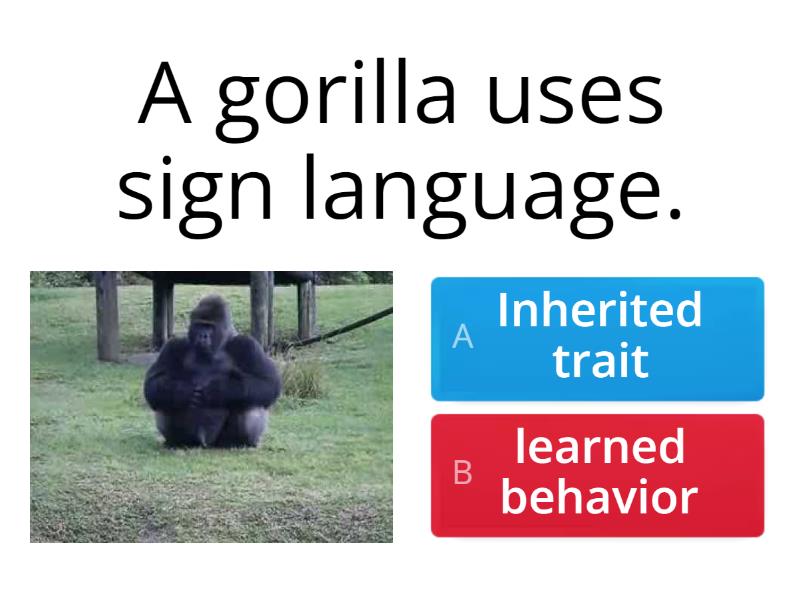 1) A gorilla uses sign language. a) Inherited trait b) learned behavior 2) A monkey knows which tree has the most fruit. a) inherited trait b) learned behavior 3) A cat has blue eyes. a) inherited trait b) learned behavior 4) A porcupine has sharp quills. a) inherited trait b) learned behavior 5) A rose has a sweet smell. a) inherited trait b) learned behavior 6) A Yucca plant blooms flowers. a) inherited trait b) learned behavior 7) A turtle has a hard shell. a) inherited trait b) learned behavior 8) An elephant walks on its back legs at the circus when the trainer whistles. a) inherited trait b) learned behavior 9) Some fish have wide tailed fins. a) inherited trait b) learned behavior 10) A seagull that has been fed by tourists at the beach returns to the area for food. a) inherited trait b) learned behavior 11) A parrot imitates a barking dog. a) inherited trait b) learned behavior 12) A herd of cattle comes running at the sound of the owner’s truck carrying hay. a) inherited trait b) learned behavior 13) A frog has a yellow color on its back. a) inherited trait b) learned behavior 14) A lizard chooses its favorite rock to sunbathe on. a) inherited trait b) learned behavior 15) A peach has a large seed in the middle. a) inherited trait b) learned behavior
