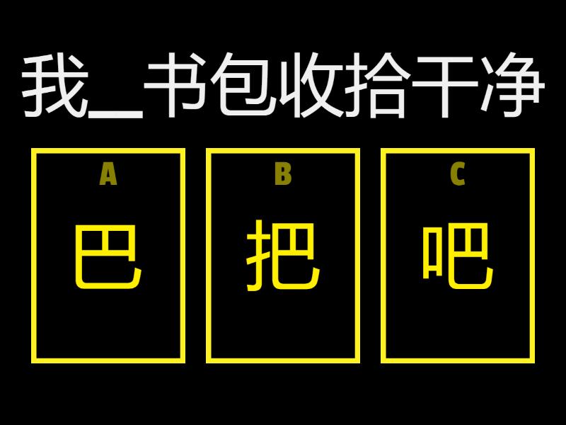 1) 我__书包收拾干净 a) 巴 b) 把 c) 吧 2) 我__给他一只猫 a) 送 b) 进 c) 适 3) 一__笔 a) 只 b) 支 4) 他很快__跑过来 a) 的 b) 得 c) 地 5) 公园里可以跑步_运动和看花 a) , b) 、 6) 我会跑步_唱歌和跳舞 a) , b) 、 7) 你喜欢唱歌_还是画画? a) , b) 、 8) 不热也不冷,有一点风。 a) 风和日丽 b) 凉风习习 9) 很着急 a) 风和日丽 b) 团团转 10) 做了好事 a) 助人为快乐之本 b) 脚踏实地