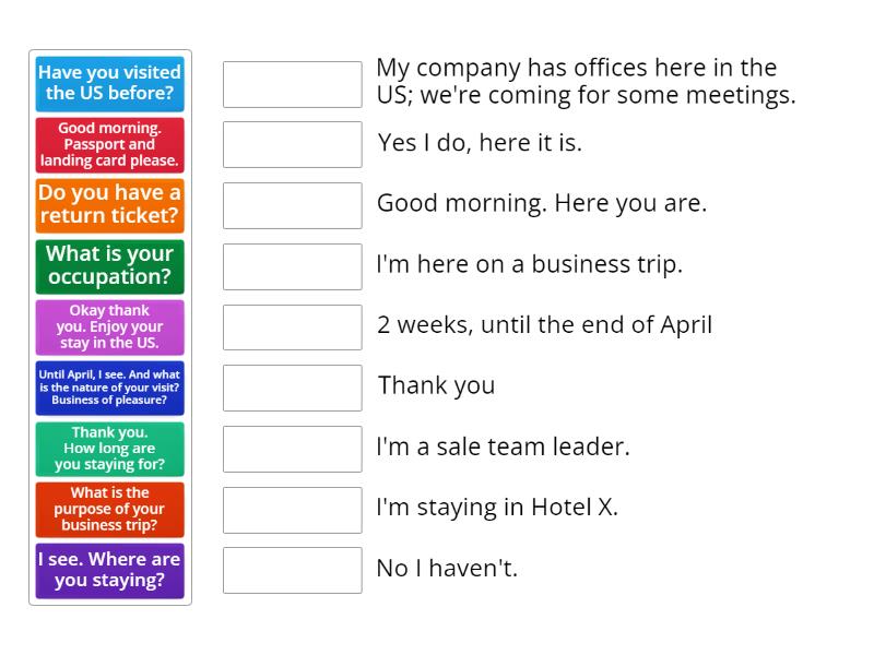 Good morning. Passport and landing card please. - Good morning. Here you are., Thank you. How long are you staying for? - 2 weeks, until the end of April, Until April, I see. And what is the nature of your visit? Business of pleasure? - I'm here on a business trip., Have you visited the US before? - No I haven't., What is the purpose of your business trip? - My company has offices here in the US; we're coming for some meetings., What is your occupation? - I'm a sale team leader., I see. Where are you staying? - I'm staying in Hotel X., Do you have a return ticket? - Yes I do, here it is., Okay thank you. Enjoy your stay in the US. - Thank you,