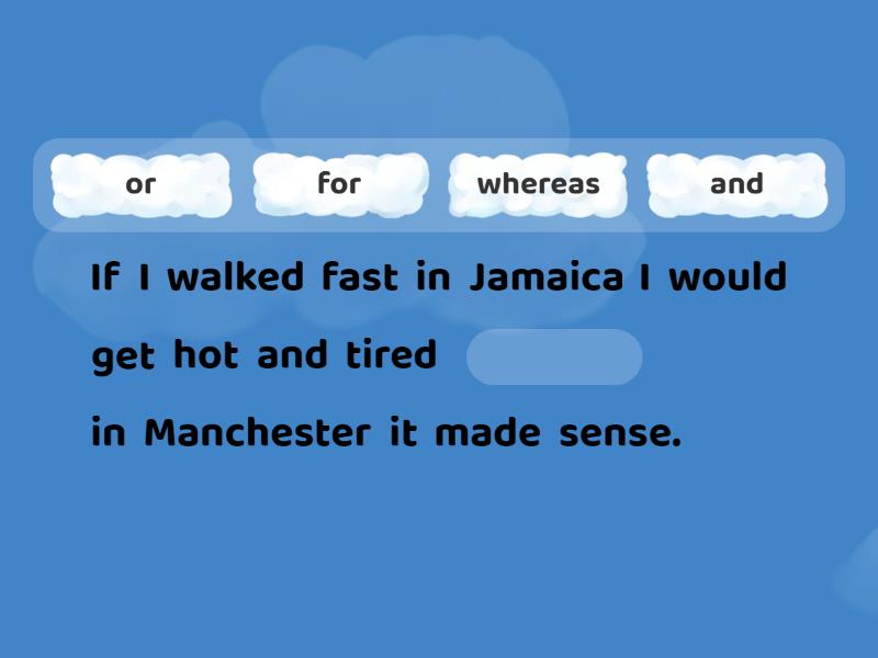 If I walked fast in Jamaica I would get hot and tired ____ in Manchester it made sense. I began getting used to it ____ it felt nothing like the freedom of Maroon Town. I saw cats and dogs in Manchester ____ i missed the goats and lizards. We had walked past parks ____ had never gone into one.