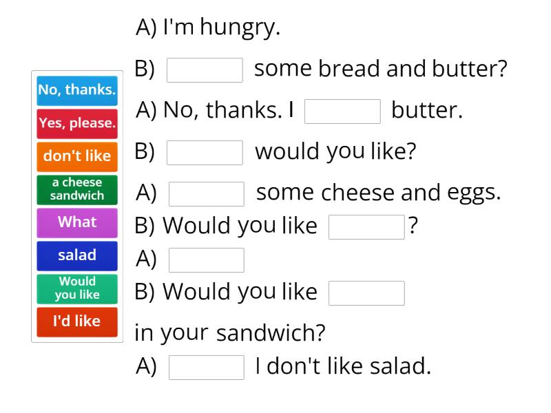 A) I'm hungry. B) ____ some bread and butter? A) No, thanks. I ____ butter. B) ____ would you like? A) ____ some cheese and eggs. B) Would you like ____? A) ____ B) Would you like ____ in your sandwich? A) ____ I don't like salad.
