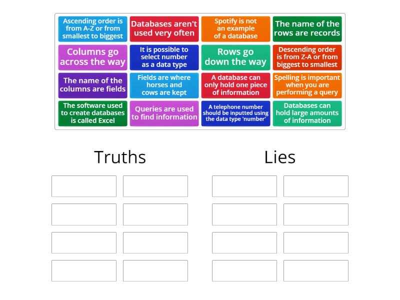 Truths: Databases can hold large amounts of information, The name of the columns are fields, The name of the rows are records, Ascending order is from A-Z or from smallest to biggest, It is possible to select number as a data type, Descending order is from Z-A or from biggest to smallest, Spelling is important when you are performing a query, Queries are used to find information, Lies: Fields are where horses and cows are kept, A database can only hold one piece of information, Databases aren't used very often, Spotify is not an example of a database, Rows go down the way, Columns go across the way, The software used to create databases is called Excel, A telephone number should be inputted using the data type 'number',