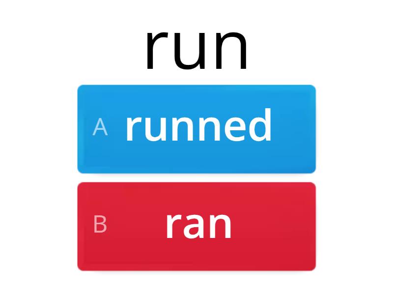 1) run a) runned b) ran 2) give a) gave b) gived 3) say a) sayed b) said 4) go a) went b) goed 5) sit a) sat b) sitted 6) put a) putted b) put 7) drink a) drinked b) drank 8) eat a) ate b) eated 9) hide a) hid b) hode 10) come a) comed b) came 11) sing a) sang b) sanged 12) build a) builded b) built 13) choose a) chose b) choosed 14) fall a) fell b) felled 15) have a) had b) haved 16) hold a) holded b) held 17) see a) saw b) seed 18) speak a) speaked b) spoke