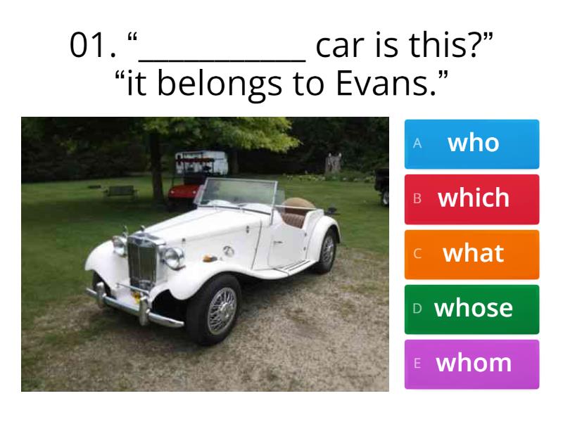 1) 01. “___________ car is this?”  “it belongs to Evans.” a) who b) which c) what d) whose e) whom 2)  . ___________ of them gave up studying? a) Who b) Whom c) Which d) Whose e) What 3) “________ is your brother like?” “He is tall and slim.” a) How b) Who c) Whom d) What e) Why 4) I just want to know this : how ______ do you go to the bank? a) much b) many c) long d) far e) often 5) “__________ such a silly remark?" – “I did.” a) Who did you make b) Who makes c) Who did d) Who made e) Who did made 6) Someone knocks at the door. On the inside you say: a) Who is it? b) Who is he? c) Who is? d) Who is she? e) Who are? 7) _____ did you cry? _____ told you I was crying? It doesn't matter. Let's have some juice. _____ fruit do you like best? a) Why / Who / Which b) Who / What / Why c) When / Which / What d) Where / When / WhoWhat e) What / Whom / When 8) _____ is Mr. Brown? Is he a teacher? a) What b) Whom c) Which d) Whose e) Where 9) (FATEC) ______ do you treat your younger brother like that? a) Why b) Who c) Whom d) What e) Whose 10) (UNIP) _______ pencil is this, Mario's or Pedro's? a) Who b) When c) Whose d) How e) Where