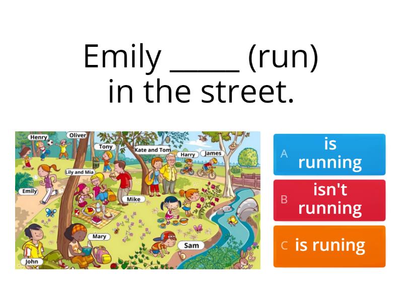 1) Emily _____ (run) in the street. a) is running b) isn't running c) is runing 2) James and Harry ______ (ride) the bike. a) are riding b) is rideing c) aren't riding 3) Sam______(cry). a) is crying b) isn't crying c) isn't cryying 4) Lily and Mia ________ (smile). a) smiling b) are smiling c) is smile 5) Two people in the back _____ (play) football. a) is playing b) are playing c) isn't playing 6) Harry and James ______ (cycle). a) is cycling b) aren't cycling c) are cycling 7) Sam ________ (look) at the snail. a) isn't looking b) is lookking c) is looking 8) Mary________ (listen) the music. a) isn't listening b) is listening c) listening 9) John and Mary _____ (sit) under the tree. a) isn't sitting b) are sitting c) is siting 10) Mike ______ (eat) a sandwich. a) isn't eating b) eating c) is eating 11) Kate and Tom ________ (look) at the river. a) are look b) are lookking c) are looking