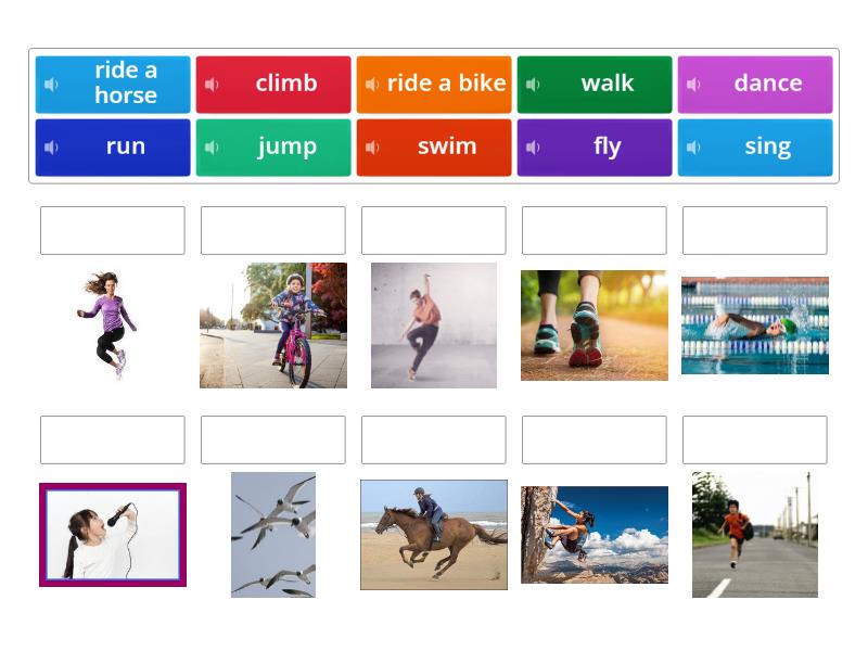 dance, walk, run, climb, jump, swim, ride a horse, fly, sing, ride a bike,