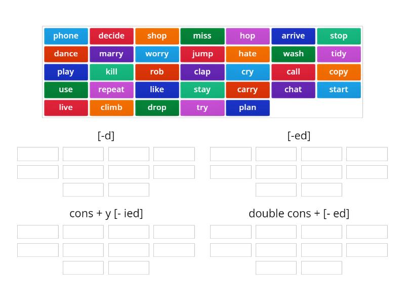 [-d]: dance, like, use, decide, arrive, hate, live, phone, [-ed]: miss, play, stay, start, kill , jump, climb, wash, call, repeat, cons + y [- ied]: worry, try, cry, carry, marry, tidy, copy, double cons + [- ed]: stop, plan, hop, clap, drop, rob, chat, shop,