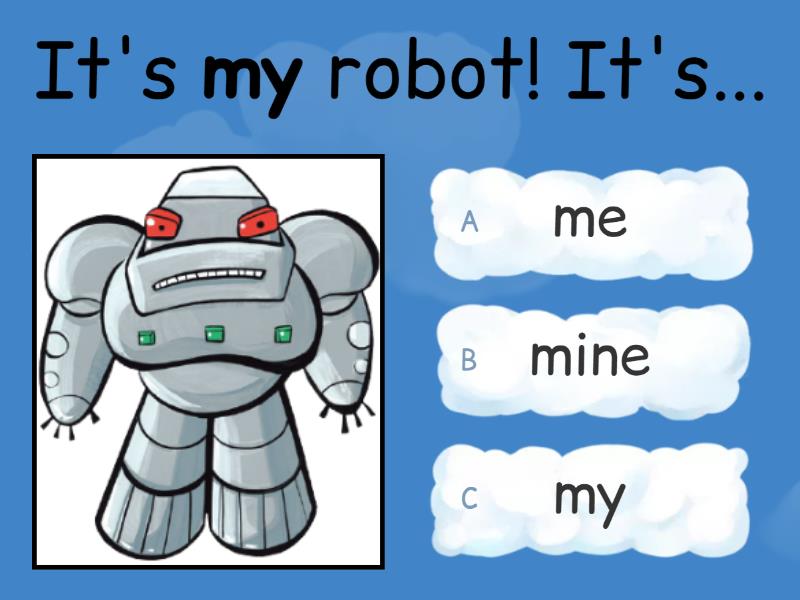 1) It's my jacket! It's... a) mine b) yours c) my 2) They're your socks! They're... a) mine b) your c) yours 3) They're your trousers! They're... a) your b) yours c) mine 4) It's my camera! It's... a) my b) mine c) yours 5) It's your kite! It's... a) yours b) your c) you 6) It's my robot! It's... a) me b) my c) mine 7) It's your watch! It's... a) yours b) you c) your 8) It's my phone! It's... a) mine b) me c) my 9) It's my lamp! It's... a) my b) yours c) mine 10) It's your clock! It's... a) your b) yours c) you