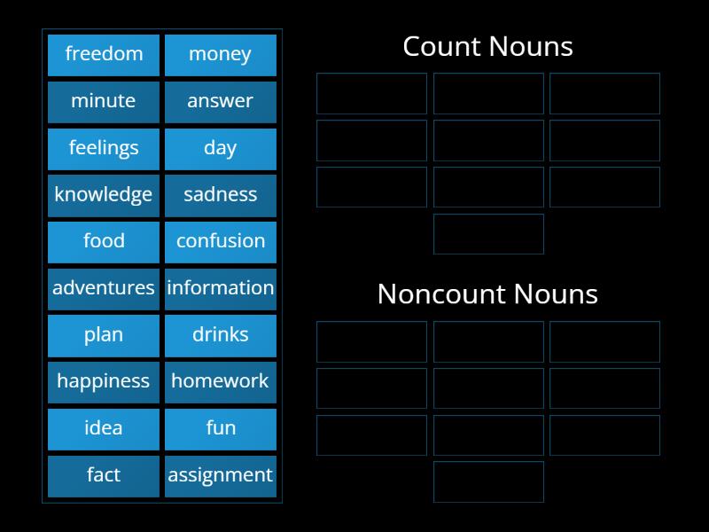 Count Nouns: adventures, answer, assignment, day, drinks, fact, feelings, idea, minute, plan, Noncount Nouns: confusion, food, freedom, fun, happiness, homework, information, knowledge, money, sadness,