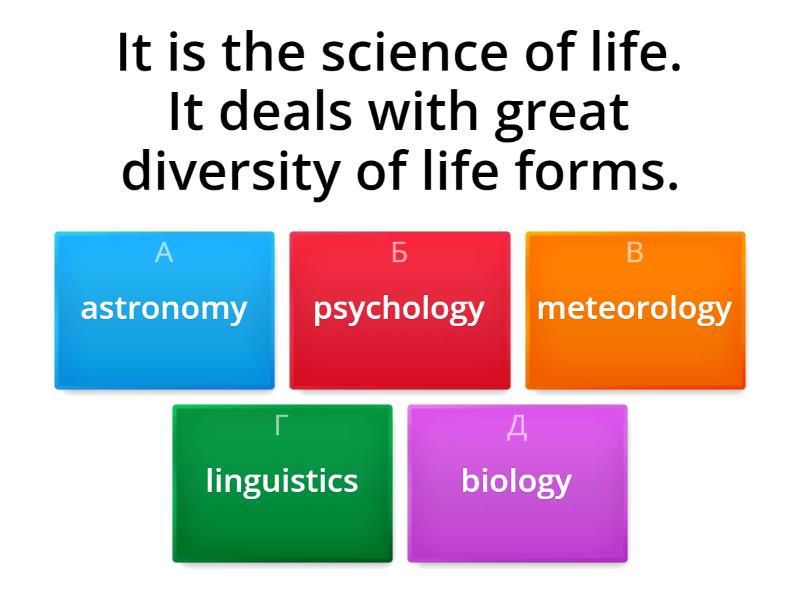 1) It is the science of life. It deals with great diversity of life forms. a) astronomy b) psychology c) meteorology d) linguistics e) biology 2) It deals with the scientific observation and study of the phenomena of weather and climate. a) astronomy b) psychology c) meteorology d) linguistics e) biology 3) It is the science of the stars. It deals with celestial bodies such as our earth, its moon, the sun, the other planets. a) astronomy b) psychology c) meteorology d) linguistics e) biology 4) It is the study of the way in which language works. a) astronomy b) psychology c) meteorology d) linguistics e) biology 5) It is the science of mental life which studies human and animal behavior. a) astronomy b) psychology c) meteorology d) linguistics e) biology