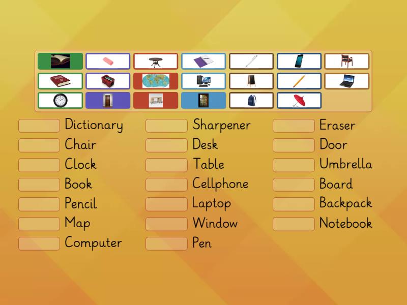 Cellphone, Window, Umbrella, Board, Table, Pencil, Pen, Eraser, Dictionary, Book, Notebook, Chair, Clock, Backpack, Door, Map, Laptop, Computer, Desk, Sharpener,