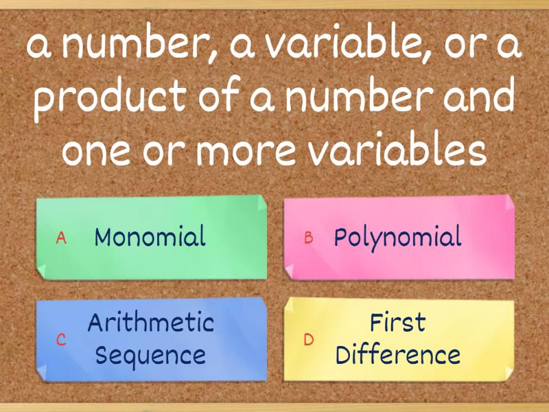 1) a number, a variable, or a product of a number and one or more variables a) Monomial b) Polynomial c) Arithmetic Sequence d) First Difference 2) the sum of two monomials a) Absolute Maximum b) Binomial c) Rate of Change d) Range of a Function 3) A monomial or a sum or difference of monomials a) First Difference b) Second Difference c) Polynomial d) Absolute Maximum 4) the greatest degree of any term in the polynomial a) Degree of a Polynomial b) Line of Symmetry c) Arithmetic Sequence d) Function 5) a relation in which each element of the domain is paired with exactly one element of the range a) Discrete b) Average Rate of Change c) Interval d) Function 6) a sequence in which each term is found by adding the same number to the previous term a) Quadratic Function b) Arithmetic Sequence c) Absolute Maximum d) Interval Notation 7) a function in which the graph of the solutions forms a line a) Domain of a Function b) Recursive Equation c) Linear Function d) Set Notation 8) a sequence in which each term is found by multiplying the previous term by the same number a) Geometric Sequence b) Polynomial c) Interval d) Recursive Equation 9) a function that can be described by an equation of the form y= a*b^x, where b > 0 and b ≠ 1 a) Exponential Function b) Recursive Equation c) First Difference d) Second Difference 10) a function that can be written in the form f(x) = ax2+bx+c, where a,b,and c are real numbers and a ≠ 0, in which the graph of the solutions creates a "U" shaped curve. a) Absolute Maximum b) Quadratic Function c) Arithmetic Sequence d) Continuous 11) the form of an equation that uses the previous term to define the next term of the sequence. a) Explicit Equation b) Absolute Minimum c) Recursive Equation d) Discrete 12) an equation for a term in a sequence that determines the value of any term t(n) directly from n, without necessarily knowing any other terms in the sequence. a) Explicit Equation b) Linear Function c) Degree of a Polynomial d) Binomial 13) going on without a stop or break a) Degree of a Polynomial b) Continuous c) Absolute Minimum d) Average Rate of Change 14) unconnected; separate; distinct a) Discrete b) Function c) Geometric Sequence d) Domain of a Function 15) a rate that describes how one quantity changes in relation to another a) Rate of Change b) First Difference c) Interval Notation d) Quadratic Function 16) the slope of a specific interval between where x is a to where x is b. [a, b] a) Domain of a Function b) Absolute Minimum c) Average Rate of Change d) Linear Function 17) the difference between two consecutive y-values in a table in which the difference between the x-values is constant a) Continuous b) First Difference c) Monomial d) Recursive Equation 18) differences that are found by subtracting consecutive first differences from one another. a) Second Difference b) Explicit Equation c) Absolute Maximum d) Interval 19) The set of all possible x-values (inputs) for the function a) Absolute Minimum b) Absolute Maximum c) Range of a Function d) Domain of a Function 20) The set of all possible y-values (outputs) for the function a) Range of a Function b) Linear Function c) Polynomial d) Function 21) When you have a set of numbers and you put them in "{ }" a) Absolute Maximum b) Absolute Minimum c) Set Notation d) Interval 22) all of the numbers between two specific x-values. a) First Difference b) Discrete c) Interval d) Set Notation 23) a notation for describing an interval on a number line. The interval's endpoint(s) are given, and a parenthesis or bracket is used to indicate whether each endpoint is included in the interval. a) Polynomial b) Binomial c) Exponential Function d) Interval Notation 24) The highest point on the graph over the entire domain of a function or relation. a) Absolute Maximum b) Interval Notation c) Absolute Minimum d) Degree of a Polynomial 25) The lowest point on the graph over the entire range of a function or relation. a) Exponential Function b) Arithmetic Sequence c) Absolute Minimum d) Polynomial 26) a line that divides a figure into two halves that are mirror images of each other a) Degree of a Polynomial b) Line of Symmetry c) Second Difference d) Geometric Sequence
